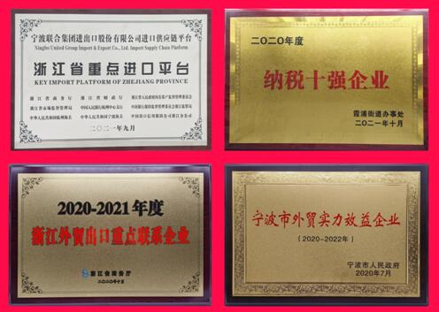 日前公司被評為2020年度北侖霞浦街道納稅十強企業,旗下子公司寧波聯合天易通信息技術有限公司獲評2021-2022年度浙江省重點培育電商平臺企業。