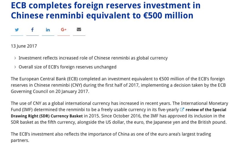 在美聯(lián)儲(chǔ)加息之前,6月13日,歐洲央行突然宣布:增持價(jià)值5億歐元的人民幣作為外匯儲(chǔ)備。這是歐洲央行首次持有人民幣外匯儲(chǔ)備。歐洲央行增持人民幣的決定,最早要追溯到1月20日。雖然這個(gè)決定早早做出,但一直沒有找到合適的機(jī)會(huì)。