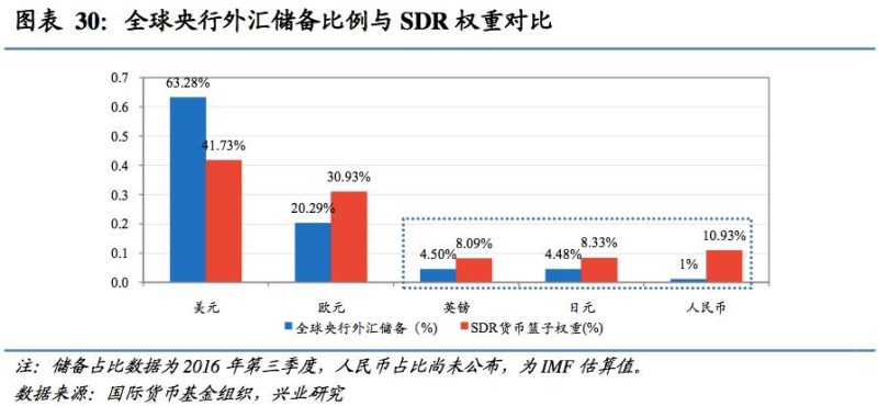 興業(yè)研究今年1月的《人民幣國(guó)際化半年報(bào)》中就曾分析到,全球央行對(duì)于人民幣的儲(chǔ)備需求將逐漸增加 。全球SDR總量為1826億,折成美元僅約3000億美元。以人民幣所占SDR份額10.92%的比例進(jìn)行折算,人民幣由SDR作為收支結(jié)算而引起的增配效果大約為2000億人民幣左右。
